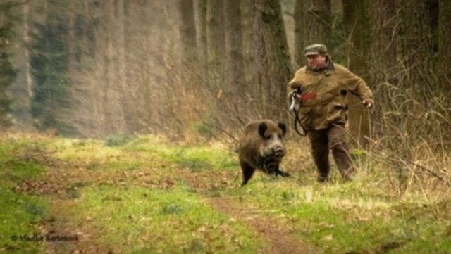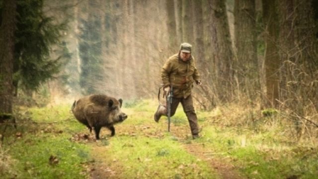 那猎人差点就成了野猪的猎物!还好他比野猪快一步。