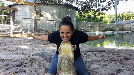 美怀孕7个月准妈妈与鳄鱼玩搏斗