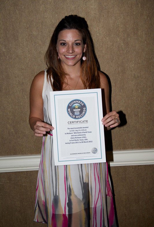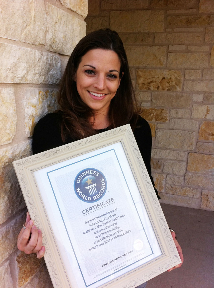 去年3月,28岁的艾丽西亚·里奇曼(Alicia Richman)生下儿子后,发现自己奶水实在太多。当里奇曼不知如何处理多余奶水时,她了解到北德州母乳银行专门收集母乳,提供给那些有需要的重症病婴或早产儿时,她便高兴地开始了不平凡的捐乳行动。从2011年6月至2012年3月间,她共向这家非营利性的慈善机构母乳银行捐赠了11115盎司母乳,并意想不到的创下了新的世界纪录。