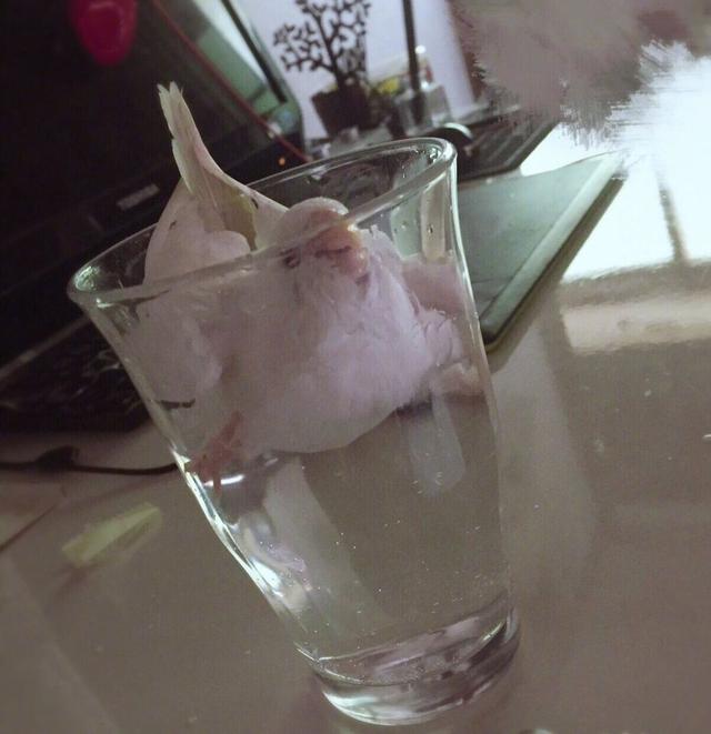 当主人满怀期待,想看看她家宠物鸟会用何种机智的方式喝到杯子里的水时