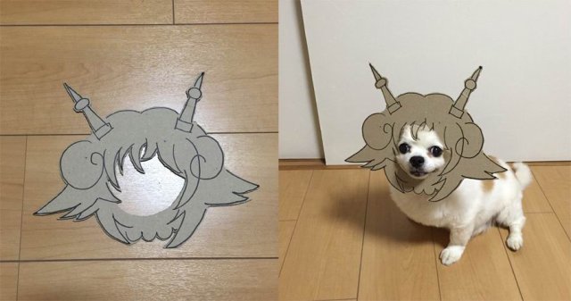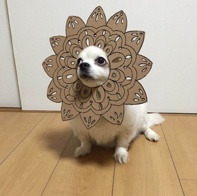 千羽把自己的纸箱剪纸作品和狗狗完美无缝衔接,而狗狗也非常乖巧,完全没有偶像包袱,老老实实的配合主人。