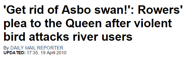 我跟Asbo聊过了。。 Asbo告诉了他一个催人泪下的故事: 其实它本来是一只好鹅。。但是2009年他的一个小天鹅被划船的人弄死了。。 所以这次啊开始疯狂报社。。。