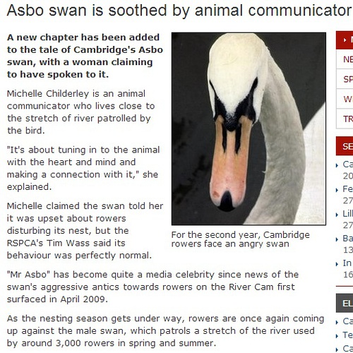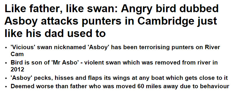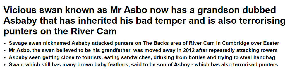 曾经何时。。。在剑桥的剑河上。。有一只叫Mr Asbo的天鹅。。。。当时Asbo是一只河霸。 脾气非常烂。。。 各种袭击各种追咬在河上划船的游客。。。