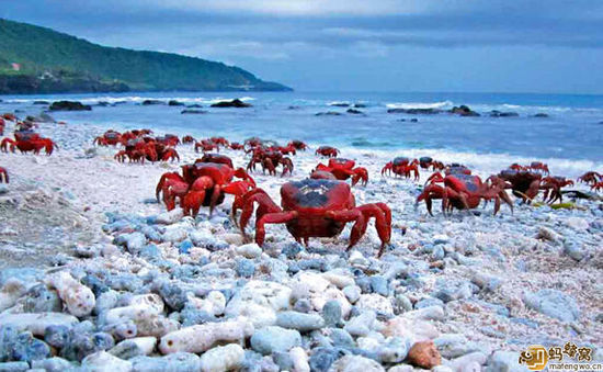 圣诞岛位于澳大利亚西北印度洋上,该岛约70%的面积都是国家公园,拥有独特的动植物资源,能看到全球仅此可见的圣诞岛红蟹大迁徙。每年的十月或者十一月的雨季,红蟹大迁徙,这里就成了它们的世界,整个迁徙能够持续18天。