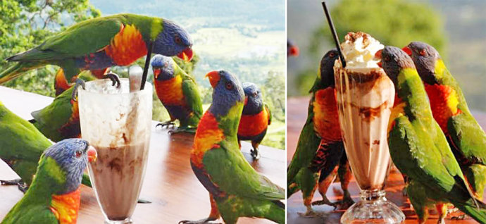 2012年12月,在澳大利亚昆士兰州的一家咖啡店中,一大群贪吃的彩虹鹦鹉趁一位客人离开时偷吃了他刚买来的一大杯奶昔,它们这种“不道德”的行为正好被旁边的其他客人拍了下来。据悉,客人离开不到一分钟,就有一只鹦鹉先下手为强,并竭力阻止其它同伴接近杯子,想独自享用这杯巧克力奶昔。但后来蜂拥而至的鹦鹉接近30只,它们将头尽可能伸进杯子里,在不到10分钟的时间里便将一大杯奶昔消灭干净,甚至连杯底也“打扫”的干干净净。