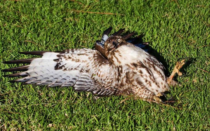 2013年1月,一名摄影师在美国加利福利亚长滩自然保护区附近抓拍到一只红尾猫头鹰在一顿饱餐后,被撑到无法动弹,只好仰面躺地上休息的场面。随后摄影师叫来保护区工作人员帮助这只贪吃猫头鹰脱困。据悉,第二天,猫头鹰状况好转许多,工作人员将它放归了大自然。