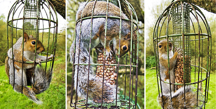 2012年11月,在英国奥克森郡阿宾登市一摄影师的花园中,一只贪吃的松鼠挤入专为鸟类放食的笼子中偷食花生米。饱餐后竟然发发现自己被困在笼子中无法脱身。据悉当它发现自己使出浑身解数也无法脱身时,表现的十分愤怒和激动。随后摄影师出面帮忙,将其放出了笼子。