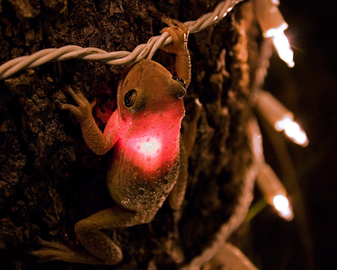 2009年9月,美国一名摄影师在自己用彩灯装饰的树上发现了一只浑身发光的树蛙。原来,这只树蛙在捕捉灯泡上的虫子时竟将灯泡整个吞入嘴中,随后只好被挂在树上。幸好被摄影师发现解救,才幸免于难。
