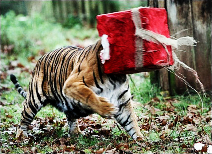 2011年12月,英国佩斯顿动物园为老虎准备了一份圣诞节“鲜肉”礼包。面对提前到来的圣诞节节礼物,这只老虎难掩喜悦,迫不及待的将脑袋伸入礼盒中享用美餐,不料被卡住,不论怎么用力都摆脱不了,最终还是管理员出面帮忙踩摆脱困境。最让人难为情的是,这一幕还被人给拍了下来,这该让这位高高在上的“森林之王”颜面何存啊!