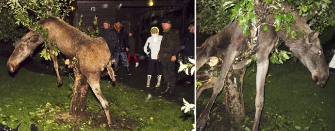 2011年9月,瑞典南部一头麋鹿因为贪吃树上的发酵苹果,把自己弄得酩酊大醉失去了平衡,发了一阵“酒疯”后卡在一棵苹果树上难以动弹,最后被消防员解救。然而,这头麋鹿获救后直接倒在地上呼呼大睡起来,它在花园中待了一晚上,直到第二天才恢复清醒,自己返回了丛林。