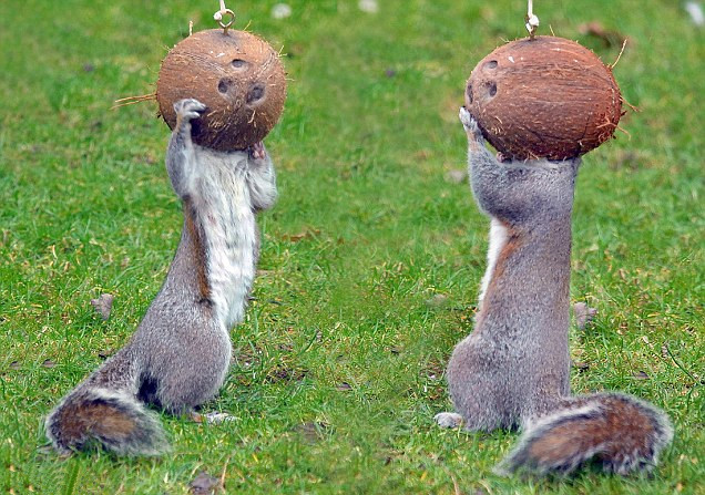 2010年3月,在英国汉普郡(Hampshire)法汉姆(Fareham)一户人家家中,两只可爱的小松鼠为偷吃这家主人的椰子将头整个探进椰子壳,令拍下这一幕的主人笑得半死。据悉,这两只松鼠可谓是主人家花园的常客加“惯偷”,常来偷食主人喂给小鸟的食物。这次中招是主人故意设的“陷阱”。