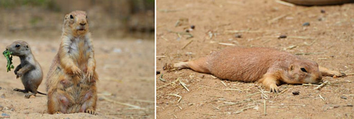2013年4月,一名喜爱的动物的摄影师在在美国马里兰动物园里拍下了一群刚出生不久的小土拨鼠随妈妈觅食的可爱场面。这很可能是小土拨鼠们第一次跟着妈妈从洞里出来觅食,只见它们新奇狂喜地放开肚皮享用美食。甚至有小土拨鼠吃的太撑,只好张开四肢,无辜的趴地上休息,憨态可掬,令人捧腹。