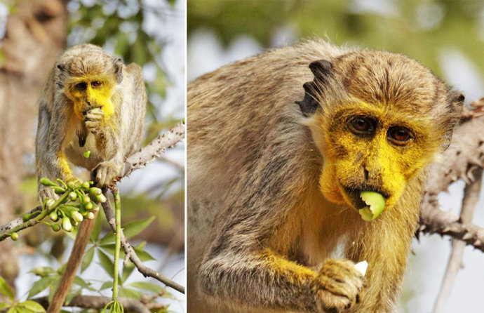 塞内加尔Niokolo-Koba国家公园,一群狨猴在树上偷吃木棉花,粘得满脸都是黄色花粉,让人一眼就看的出谁最“贪吃”。一开始,它们还假装优雅的摘一朵下来放在鼻子上闻,当发现很对自己的口味后就纷纷抢着吃了起来。