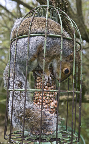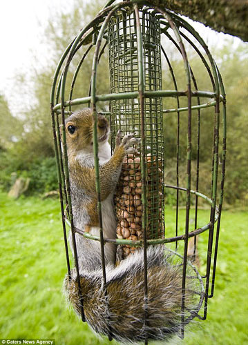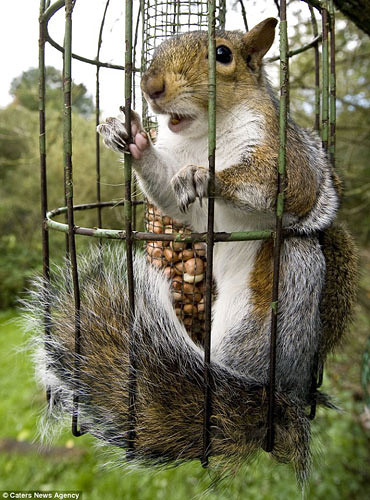 英国一贪吃松鼠挤入笼中吃食被困