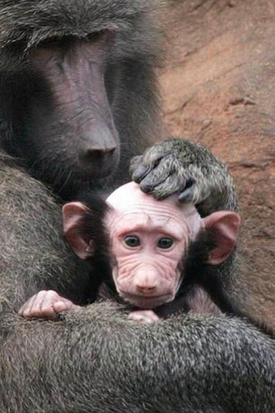 2005年10月,英国德文郡一家动物园的小狒狒雷吉,出生时全身毛发茂密,出生后没多久却成了一个“小光头”。原来,狒狒妈妈出于溺爱,终日用舌头舔拭爱子,竟让后者头部毛发严重脱落。动物园发言人诺林称:“小狒狒不会一直这么秃下去,失去的头发还会再长回来。”