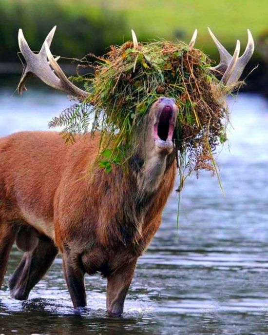 2011年11月,一头运气不好的雄鹿已经形单影只的在Richmond公园里闲逛了好几天了,最后终于忍无可忍决定尝试一点新手段。它跳到湖里把一大堆草顶在自己角上,发出长长的嚎叫来吸引雌鹿的注意。没想到这招真的很灵,在跟另一头雄鹿搏斗一番之后,它骄傲的带着两个女朋友离开了。