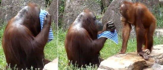 2011年8月,日本东京动物园,一只聪明的猩猩居然会浸湿毛巾给自己洗脸,还顺便享受下炎热夏季的清凉。不仅如此,它还会将毛巾拧干把脸擦干净。其一举一动和人类日常洗脸不差分毫。这只猩猩很为自己的“发明”得意,一只小猩猩也想借毛巾一用,却被它一把推开。小猩猩似乎很羡慕毛巾的用处,在一旁不断乞求。