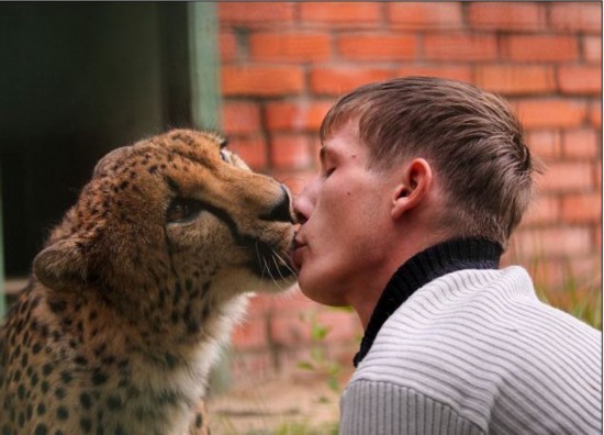 2012年3月,俄罗斯莫斯科动物园的一名兽医结交了一位非同寻常的朋友——猎豹。两位好朋友已经亲密无间到可以从容地“热吻”。这对好朋友亲密的令人难以置信,人们经常可以看到天性凶猛的赛瓦“拥抱和亲吻”安德烈。据悉,猎豹赛瓦打小就被妈妈抛弃,24岁的兽医安德烈把它带到家中,用奶瓶喂养大。塞瓦在安德烈家呆了足足有5个月之后被带到莫斯科动物园。