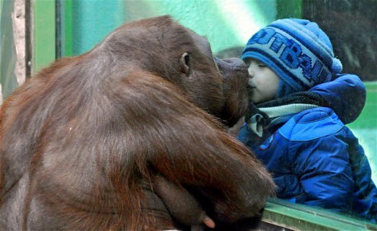 2011年11月,摄影师德米特里耶娃在俄罗斯莫斯科动物园捕捉到温馨的一幕。一个小男孩对着观察猩猩的玻璃窗嘟起小嘴,没想到另一边的大猩猩也好奇地模仿起他的动作,给了他一个大大的“吻”。照片中,小男孩看起来一点也不害怕猩猩的“亲热”,尽管他们之间仅隔了一道玻璃墙。德米特里耶娃说:“看着这幕真令人意外。”