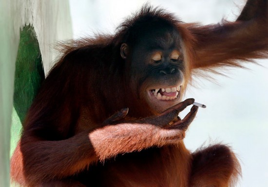 2012年7月,印尼爪哇岛一家动物园里15岁的雌性大猩猩Tori的烟龄已经有10年之久。起初源自游客扔的烟屁股,学习能力强的Tori 直接捡起来抽,从此上瘾一发不可收拾。动物园工作人员终于忍无可忍,将这只大猩猩搬到新的地方实施强制戒烟。