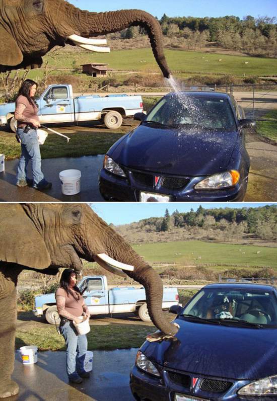 2009年7月,美国一野生动物园为了应对信贷紧缩,竟然聘请大象为游客洗车。当它们洗车时,你不用担心这些家伙会犯下什么错误,因为这些大象能够灵巧地用鼻子拿起抹布和海绵对车体进行擦拭。在这家野生动物园新开张的“大象洗车处”里,司机可以与这些大象亲密接触,洗一次车的费用仅为20美元。这家野生动物园是位于美国俄勒冈州的“游猎野生动物园”,动物园执行董事丹凡·范斯莱克表示,聘请大象为游客洗车已经取得了巨大的成功。