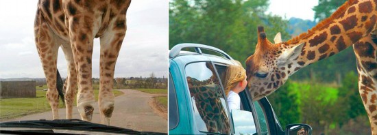 2012年5月,英国伍斯特郡的一个野生动物园内,一只长颈鹿一反常态,走到路中间,弯下长长的脖子,将自己脑袋伸进游客车内。这一幕恰巧被在后面的一名摄影师罗宾逊拍下,他还拍下了车内女孩伸手抚摸长颈鹿的照片。