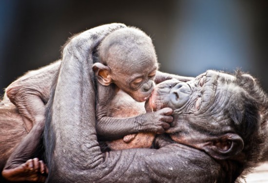 2012年2月,在美国佛罗里达州的杰克逊维尔动物园,有一只小倭黑猩猩总是抱着母亲不停地亲吻,不仅如此,它们还总是互相梳理毛发,格外亲密。然而,有观察者称,正是因为“感情泛滥”才导致它们饱受“暂时性秃头”的困扰。