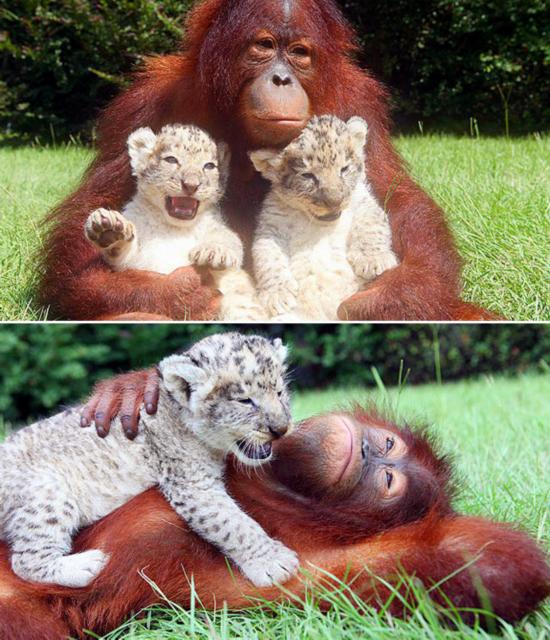 动物园红毛猩猩收养两只小白狮 亲密搂抱如“亲妈”
