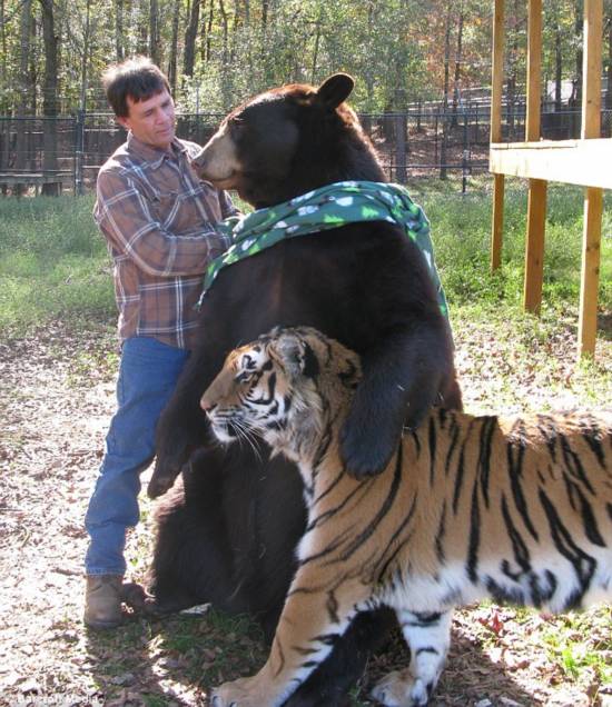 2009年12月,在美国佐治亚州动物救助中心内,狮子、老虎和黑熊这些天性孤傲的猛兽吃住同行,成了非常好的朋友。在这家名叫“诺亚方舟”动物救助中心里,老虎希尔汗、狮子里奥和黑熊巴洛生活在一起已经有好几年的时间。2001年,警方在该州亚特兰大市的一次缉毒行动中解救了这3只当时只有2个月大的小家伙,毒贩者把它们当作身份的象征一直当宠物饲养着。