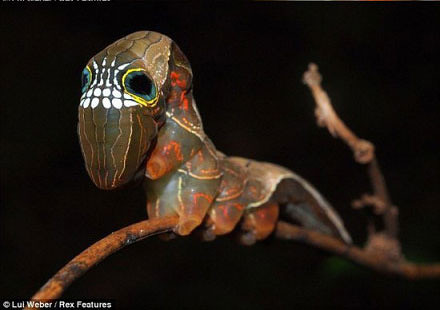 如果对自然界颁发最佳万圣节装束奖,这种头部呈现骷髅状面孔的毛毛虫应当是最终得主。这种相貌奇特的毛毛虫是粉红下翅蛾幼体,在澳大利亚雨林地区生活的濒危灭绝物种。它们具有显著的特征,头部眼睛状斑点之间分布着白色齿状纹路,这种伪装性可以吓退掠食者。