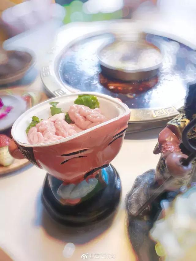 服务员揭开诸葛亮的脑袋:这里,诸葛亮的脑花,吃了聪明哦。
