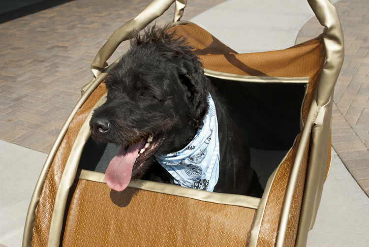 社交名媛们经常把小狗放进包中携带,那么为什么不能设计更大一点的提包把大狗放进去?于是一群来自美国明尼苏达州明尼阿波利斯设计师们聚在一起设计出了这种奇特的“大狗提包”。