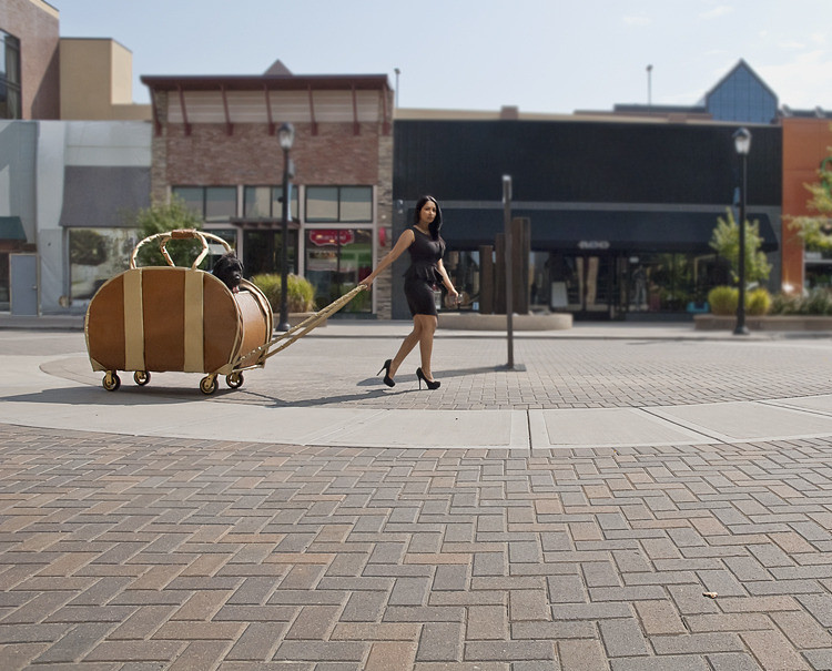 当地时间2012年10月15日,美国明尼阿波利斯市,女性出门携带的巨型手提包吸引了人们的目光。这种手提包底部有四个轮子,女性甚至可以把大型宠物放进去,逛街会友时都十分方便。