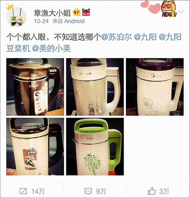说起豆浆机大戏,就是前段时间一个妹子发了条微博求推荐豆浆机,引来9万评论。