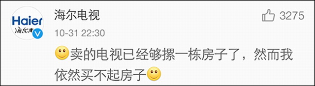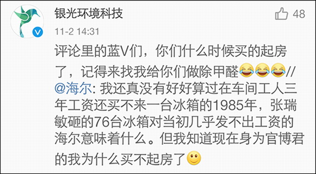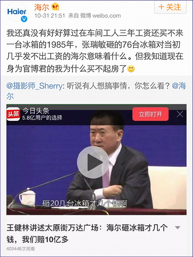 王健林口出狂言,海尔不服了,其官博在10月31日称:我还真没有好好算过在车间工人三年工资还买不来一台冰箱的1985年,张瑞敏砸的76台冰箱对当初几乎发不出工资的海尔意味着什么。但我知道现在身为官博君的我为什么买不起房了。