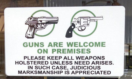 这家店门口有个告示,上面写着:欢迎持枪来用餐,不过请在不需要的时候将枪械都放入枪套内。如果你们需要使用枪支,最好保证你们的枪法不错。所以这家店里的女招待来为你点餐时候,不仅会呈上菜单和笔,还会边给腰间的手枪上膛。