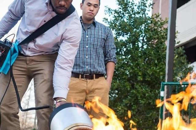 美国乔治梅森大学的两名学生仅用600美元就成功制成了一台声波灭火器原型,仅重20磅,由一个随身终端和大号音响组成;他们使用的是hip-hop中常见30-60Hz的低频音波。