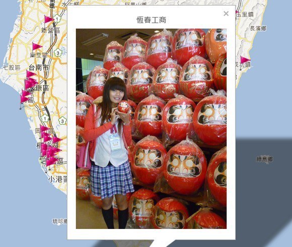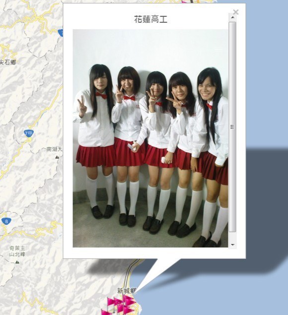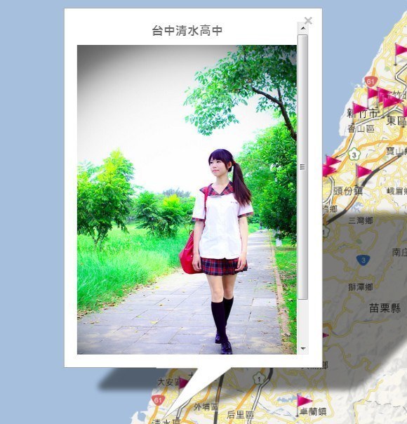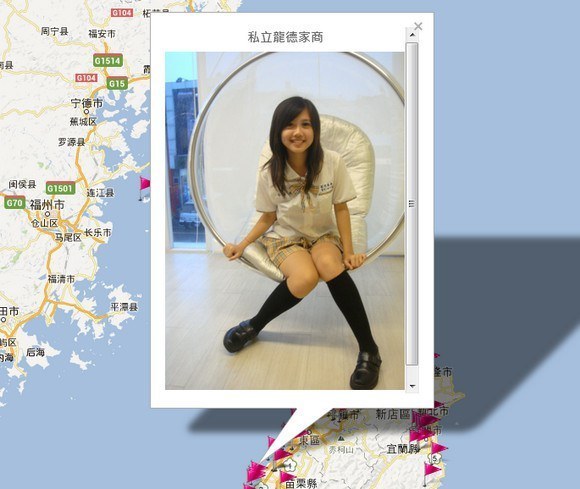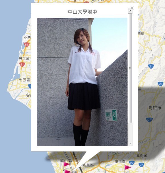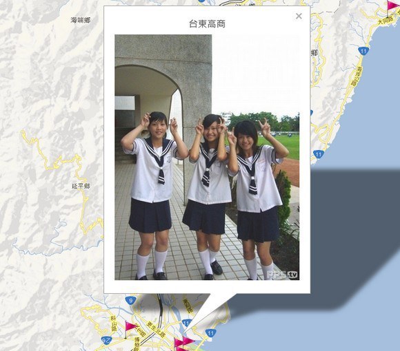 从台北这样的大城市到小到不知名的沿海小镇,宝岛以校服闪耀光辉。难以理解的是,为嘛会有人费时费力收集这些照片并集合到一幅地图里?仅仅是因为受潮流推动?还是只因某人很喜欢校服妹纸?