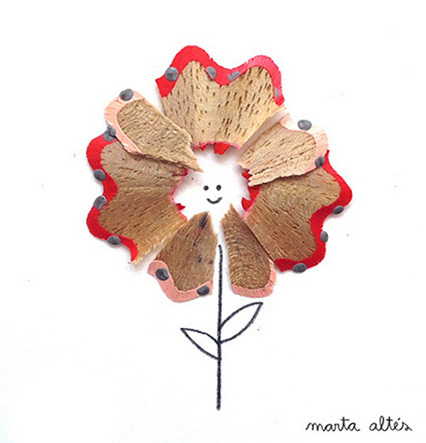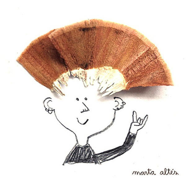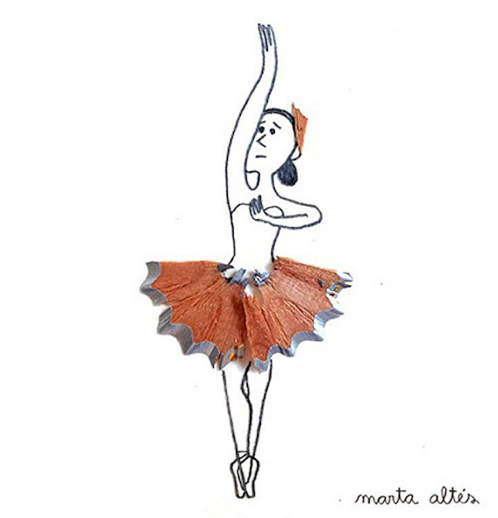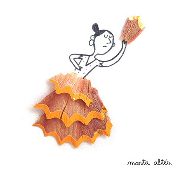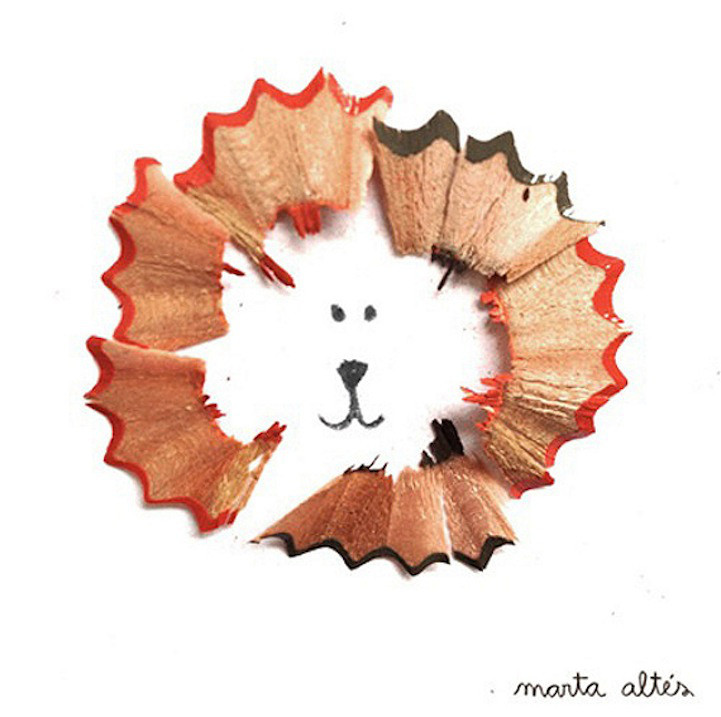 艺术家 Marta Altes 寻找一个物体作为铅笔屑的原形,通过墨水和彩色铅笔屑的搭配,创造出了这些简单而生动地插图。艺术家用自己的灵感将铅笔屑变废为宝,把他人眼中视为垃圾的铅笔屑变成了图画中亮点:蝴蝶的翅膀,芭蕾舞短裙,雄狮的鬃毛,这些元素都被铅笔屑表现的淋漓尽致。很难想象 Marta Altes 究竟有多少种创意能使这些不起眼的铅笔碎屑变身成令人赏心悦目的插画。