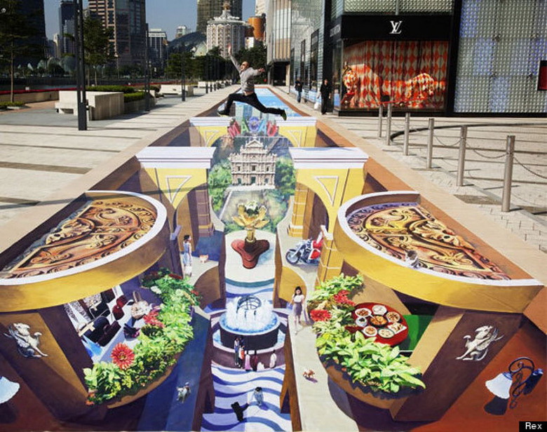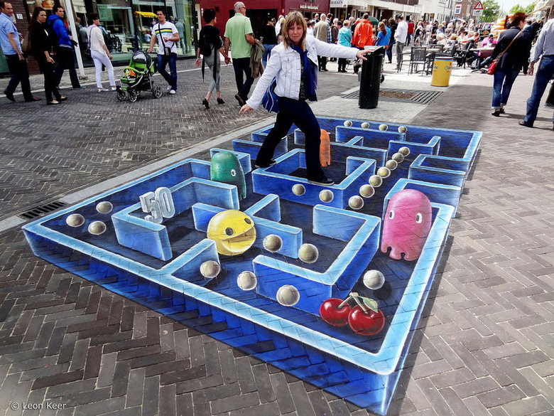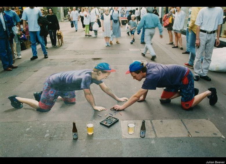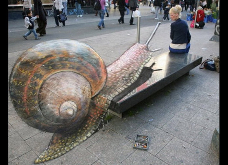 第一眼看街头艺术家朱利安.比弗斯(Julian Beever)的作品,它们像未完成的奇形怪状的动物画或者风景画的粉笔图纸。但是,如果你恰巧捕捉到了非常完美的角度,这些图像将会神奇地变换形状,呈现出巨大的变幻蜗牛或者时代广场的俯瞰画面。