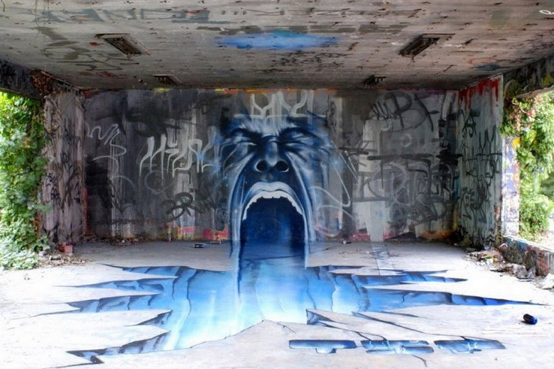 如同这幅插图呈现的主题,街头艺术家朱利安.比弗斯(Julian Beever)也创作了其他反映心灵扭曲的插画作品。