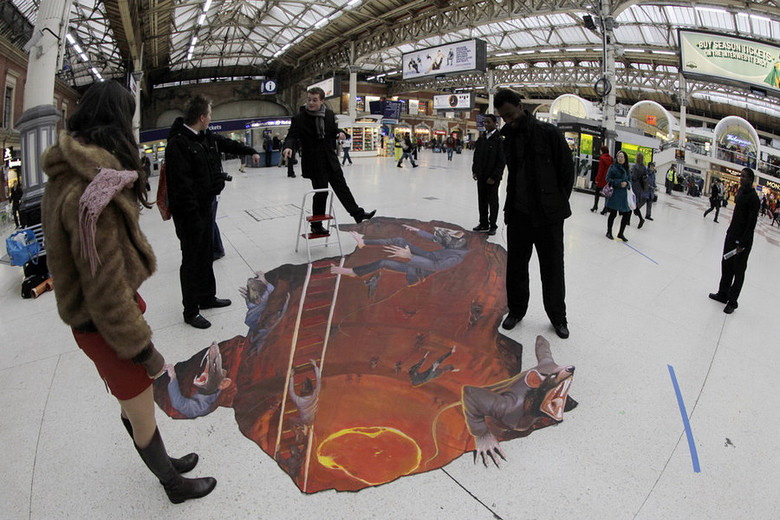 2012年1月8日,在伦敦维多利亚火车站广场上,许多乘客正在观看主题为“逃离老鼠赛跑”的三维艺术作品展览。该展览是为了推广一家消除害虫的公司。
