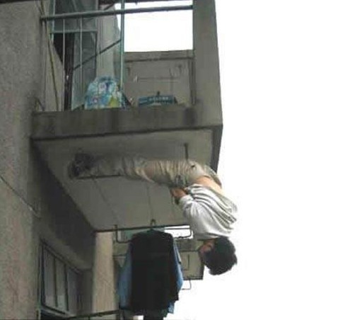 他把这叫作“倒挂金钩”,我看像“吊死猪”