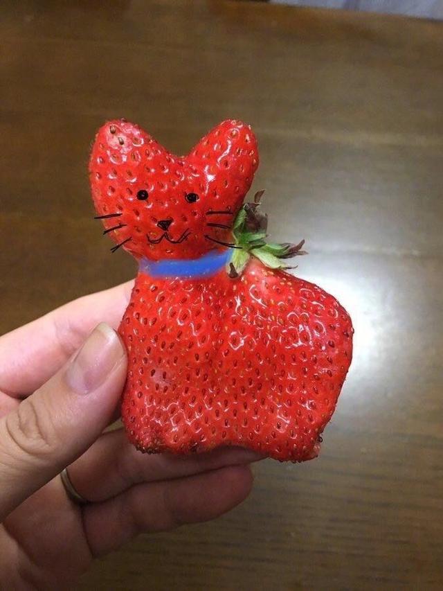 推特上一妹子吃草莓,偶然碰到一颗特别像猫咪的形状