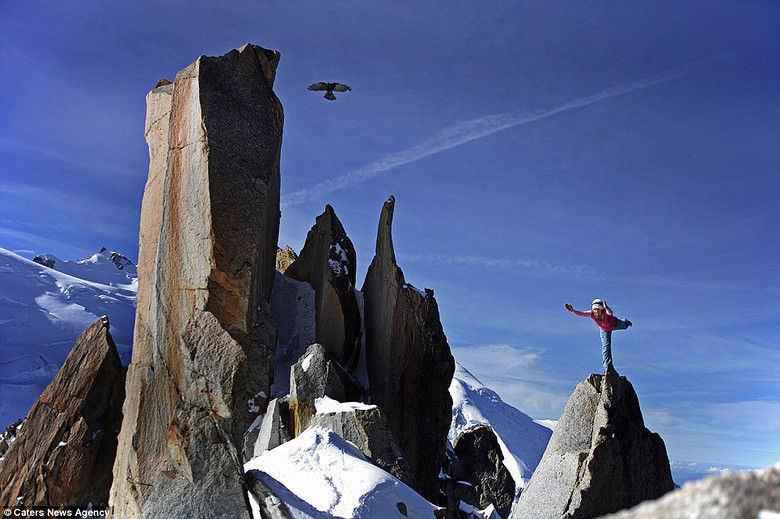 据英国《每日邮报》11月5日报道,斯洛文尼亚女登山爱好者玛蒂娜.库法(Martina Cufar)近日随摄影师登上阿尔卑斯上最高峰勃朗峰,在山顶仅一两平方米的高耸岩石上做瑜伽,展现超人的勇气和平衡能力,让人惊讶不已。