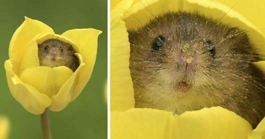 一只躲在花朵里的可爱老鼠