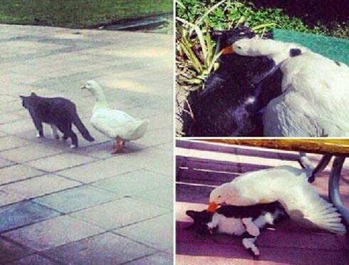 猫和鹅恋爱了,秀恩爱中......