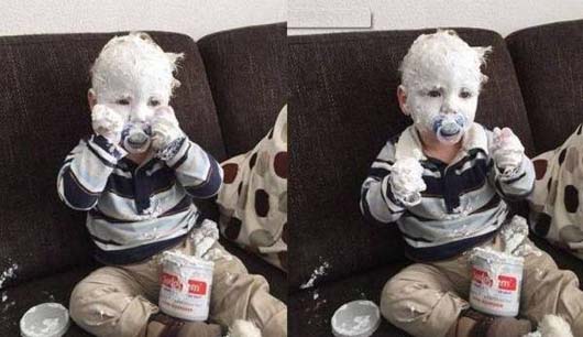 熊孩子独自在家吃奶粉,差点让妈妈都不认识啦
