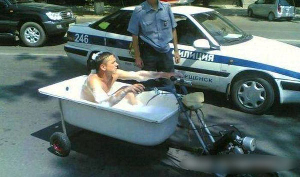 很拉风的浴缸三轮车,骑到哪里就洗到那里
