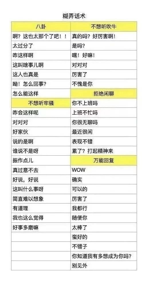 糊弄话术八卦不想听吹牛啊?这也太那个了吧!!真的吗?好厉害啊!太过分了是吗?咋这样啊嘿!好嘛!这叫啥事儿啊对对对这人也真是厉害了呦!怎么回事?不愧是你怎么能这样拒绝闲聊不想听牢骚你不上班吗咋会这样呢上班不忙吗对对对你很无聊吗好家伙最近很闲说的是啊表现不错谁说不是呀累了?打起精神来振作点儿万能回复真过意不去WOW 好说,好说确实这叫什么事呀可以的简直难以想象厉害了有道理我都行我也这么觉得随便你好事多磨嘛太棒了蛮好的不错子你知道我有多想成为你吗?别见外